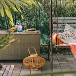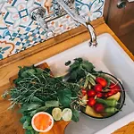 The kitchen amenities at the property feature a microwave oven, an electric kettle, and a refrigerator, provided in an outdoor dining area.